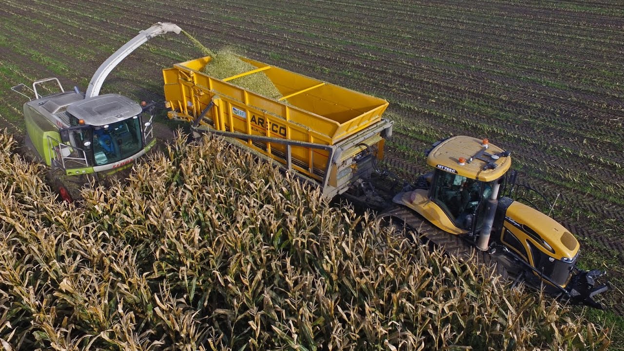 The forage harvester and excavator belong to a contractor and the tractors and trailers are from the largest organic farmer in the country: ERF. The maize silage was transported by lorries to dairy farmers across the country since this farm has no animals of its own. There is a big demand from organic farms for maize silage.
