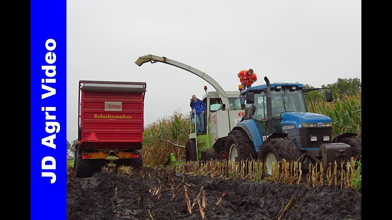 Loonbedrijf / Contractor H.Brand uit Staphorst (Nederland / The Netherlands ) aan het mais hakselen en modderen / vastzitten / Stuck in the mud / harvesting maize / maisernte / mais häckseln im Schlamm / corn silage/ kukurydza met een Claas Jaguar 840, New Holland T7050 en Massey Ferguson 7619 met Schuitemaker Siwa 180 en een New Holland 8670 als sleeptrekker.