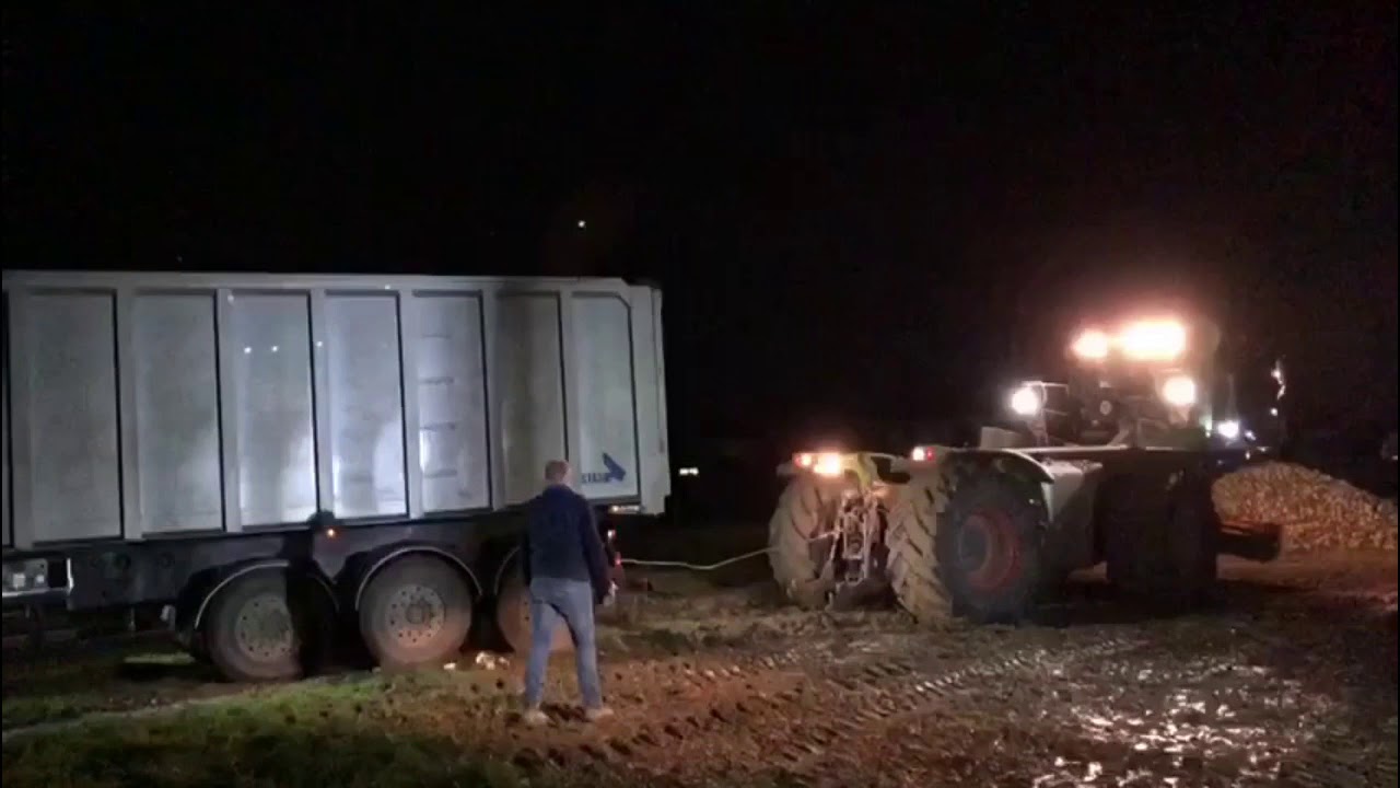 Vrachtwagen geladen me bieten glijdt van de weg Claas Xerion begint aan de klus ..