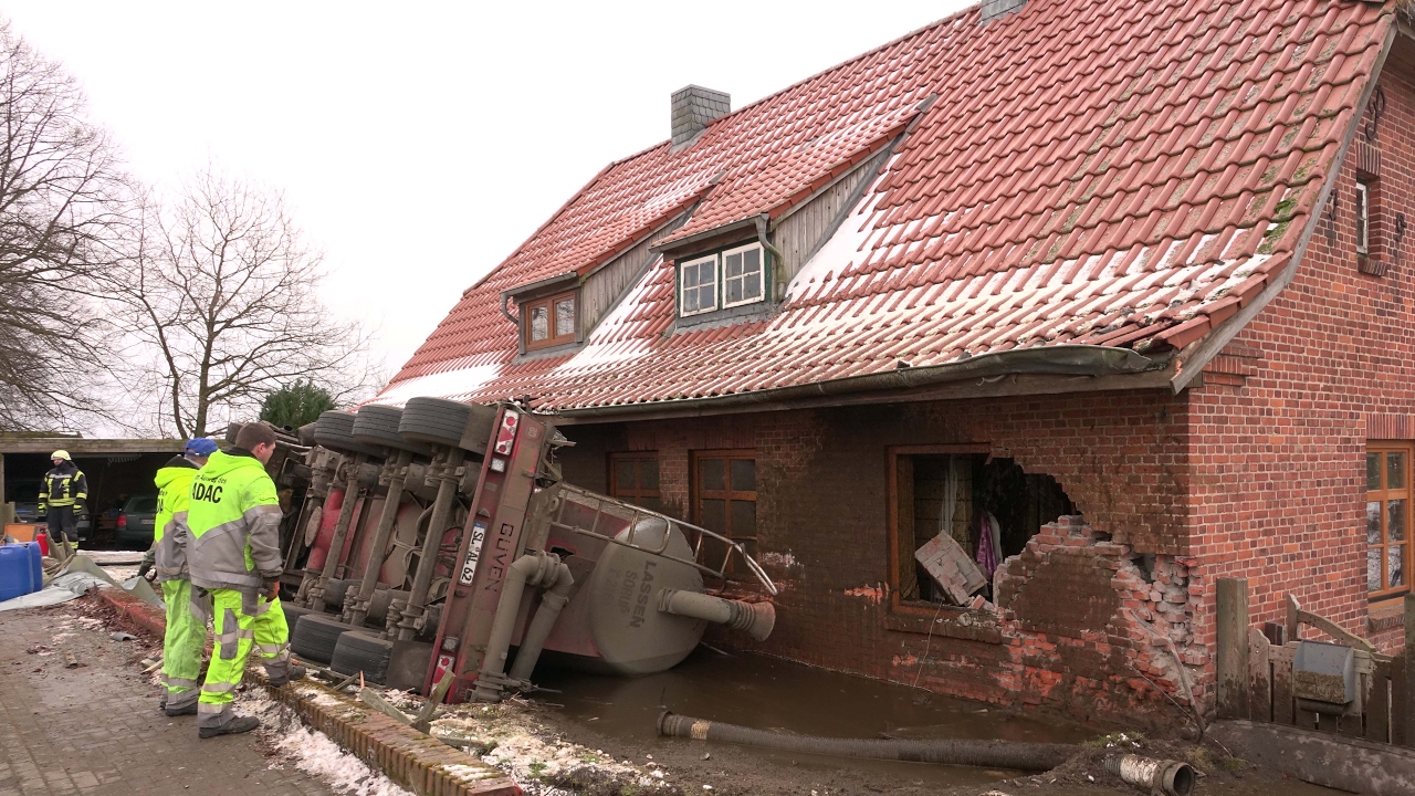 in videosTruck vliegt uit de bocht, huis vol met mest!