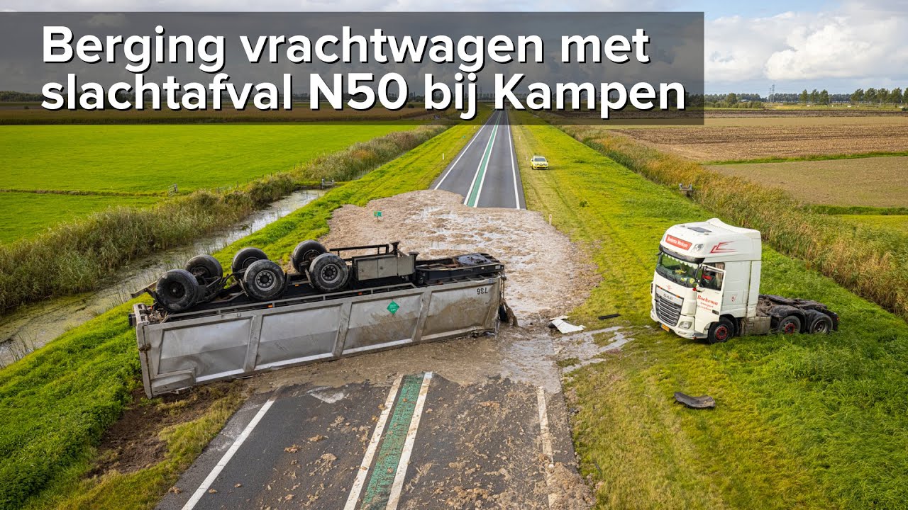 in videosBerging gekantelde vrachtwagen met slachtafval op de N50 bij Kampen