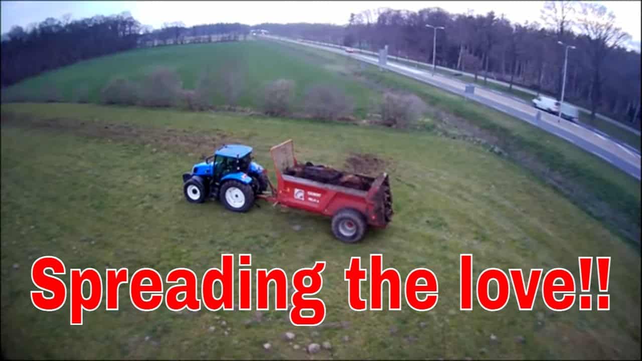 Alex aan het meststrooien met een Gibert strooier