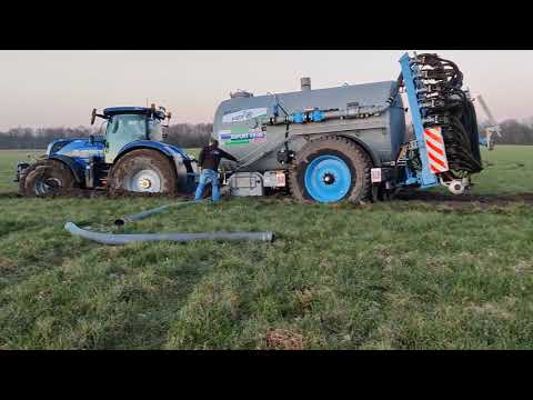 in videosStuck in the mud New Holland T7 with slurry tank winched out of the mud by a Steyr 4145