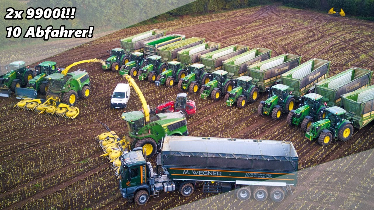 in videosM. Wegner aan het hakselen 2020 met 2x John Deere 9900i en een 8400i hakselaars en 12x John Deere trekkers. — JP Agrar