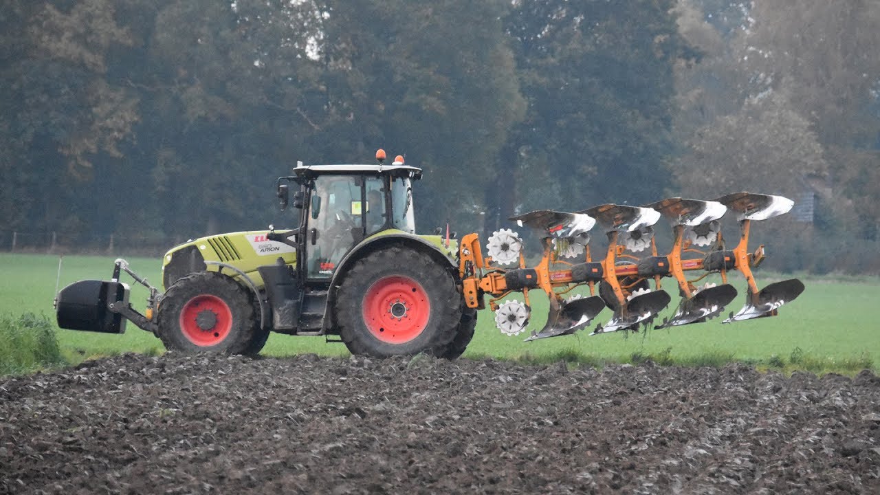 Ploegen in de polder met een Claas Arion 650 en Rumptstad 4-schaarploeg. Mick Jaguar