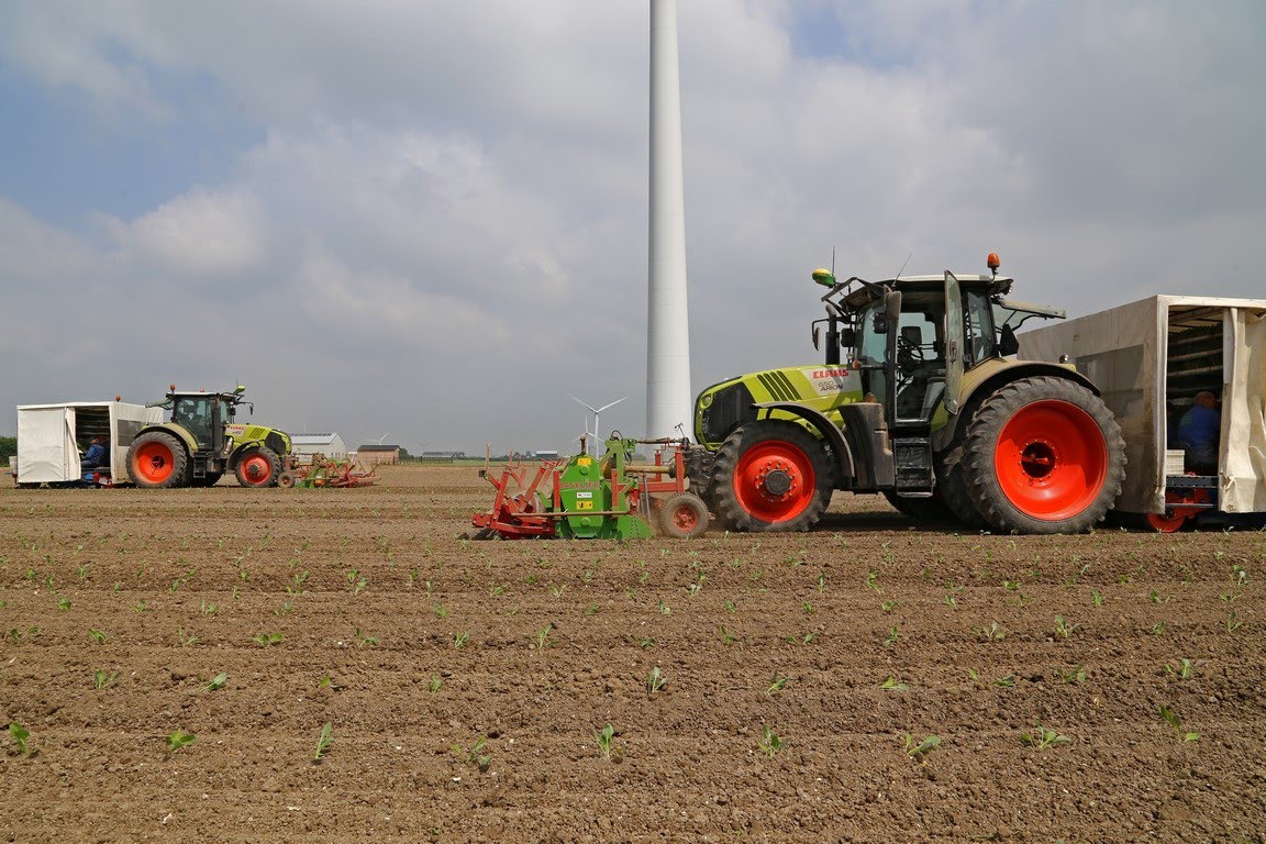 Two identical Claas Arion 650 tractors are used. They are working nearly fully autonomous. Only on the headlands a driver comes into play to turn them round. The next step is to automate this, which is already possible through the John Deere GPS system. Both tractors feature a Baselier hook tine cultivator on the front to prepare the soil, which has been power harrowed in this case. On the back are two Ferrari four row planting machines that plant four rows at a 3m working width giving a row spacing of 75cm, much like potatoes.