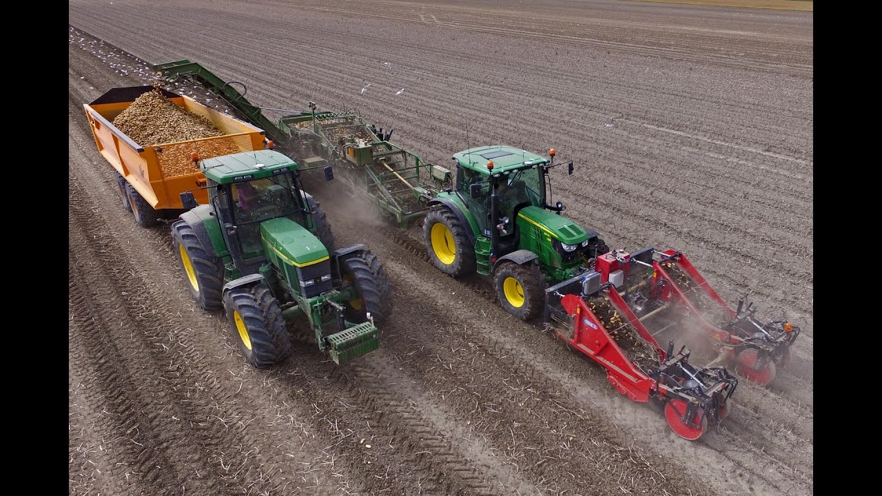 Seed potatoes are lifted in this video with a very impressive outfit. Despite the harvester tractor only being a John Deere 6115R (140 HP with boost) it is still capable of lifting four 75cm rows of potatoes. On the front is a Tolmac TM 14 front harvester and on the rear a Krakei two row trailed harvester. The front machine drops the crop between the middle two rows.